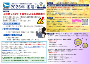 入居者様向けにおすすめの情報や、アミックスからお知らせ、新たな企画やサービスのご紹介などを掲載しています。発行は3ヶ月に1回、入居者様専用アプリからもご覧いただけます。バックナンバーはこちら